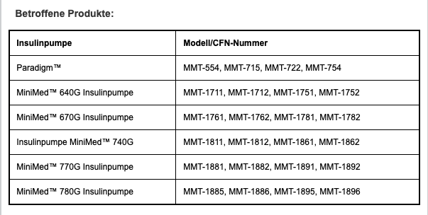 Dieses Problem und die erforderlichen Maßnahmen kann alle Pumpenmodelle der MiniMed™ Paradigm™, MiniMed™ 600 und MiniMed™ 700 Serie betreffen.